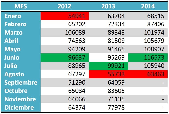 Según este cuadro los meses de junio y julio son los que presentan mayor nivel de matriculación de todo el año algo que se repite en los tres años analizados, mientras que, a excepción de 2012, cuyo mes de enero se considera uno de los peores en los últimos años en la venta de vehículos, parece que el mes de agosto es uno de los peores momentos para la compra y matriculación de vehículos nuevos. Podemos también comprobar cómo, efectivamente, los meses de diciembre y enero no parecen brillar excesivamente como tradicionalmente se suponía puntos estacionales de venta para vehículo nuevo.