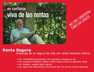 Caja Rioja está comercializando dos seguros interesantes, ya les comentábamos acerca del Seguro Vida 10. Ahora también ofrece el nuevo seguro de Vida – Ahorro denominado «Renta Segura», que a cambio de una aportación única se garantiza al asegurado el cobro de una renta mensual para toda la vida.